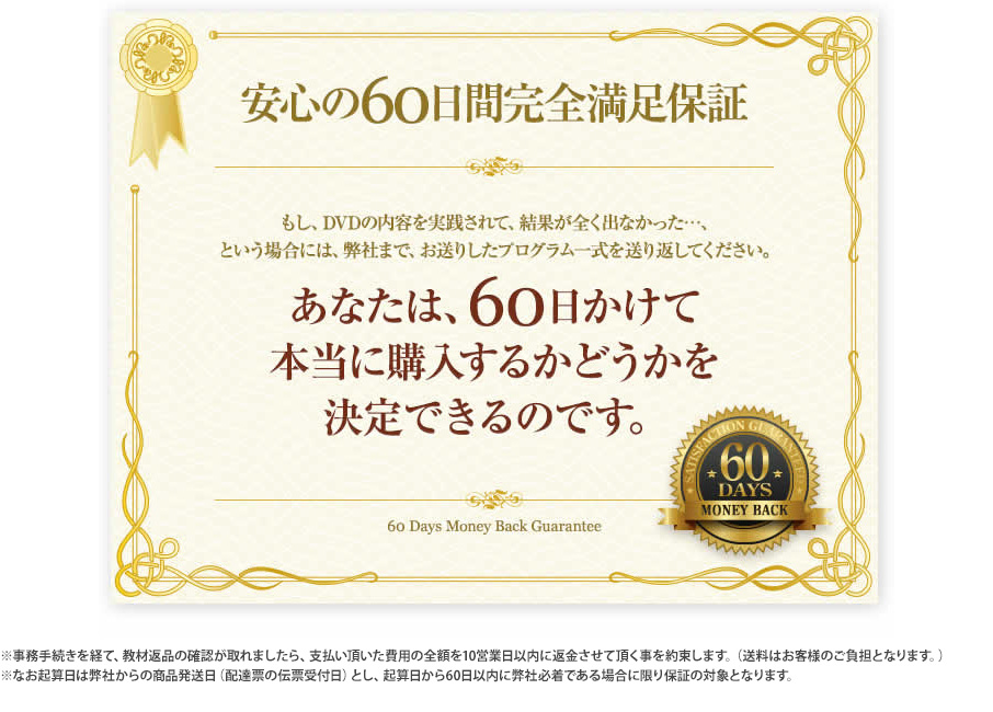 もし、DVDを購入して頂き、今よりも技術的なスキルが上がらない、或は実践したにも関わらず施術効果がみられないということであれば、弊社商品配送日から60日以内(必着)であれば、全額返金します。