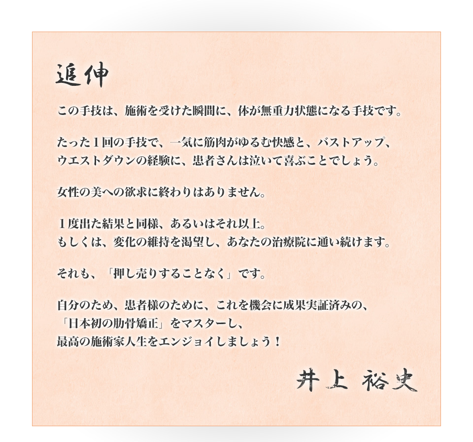 もちろんDVDなので直接井上先生から指導は受けられないものの、肋骨矯正で先行利益を獲得できるだけでなく、治療効果はお墨付き。