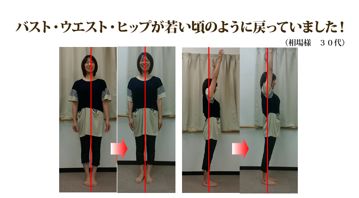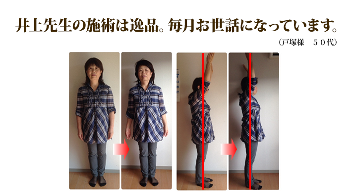 井上先生はいつも、ついでだよと言って、色々やってくれるのがうれしいです。施術が終わったあとはなんとバスト、ウエスト、ヒップが若いころのように戻っていました。